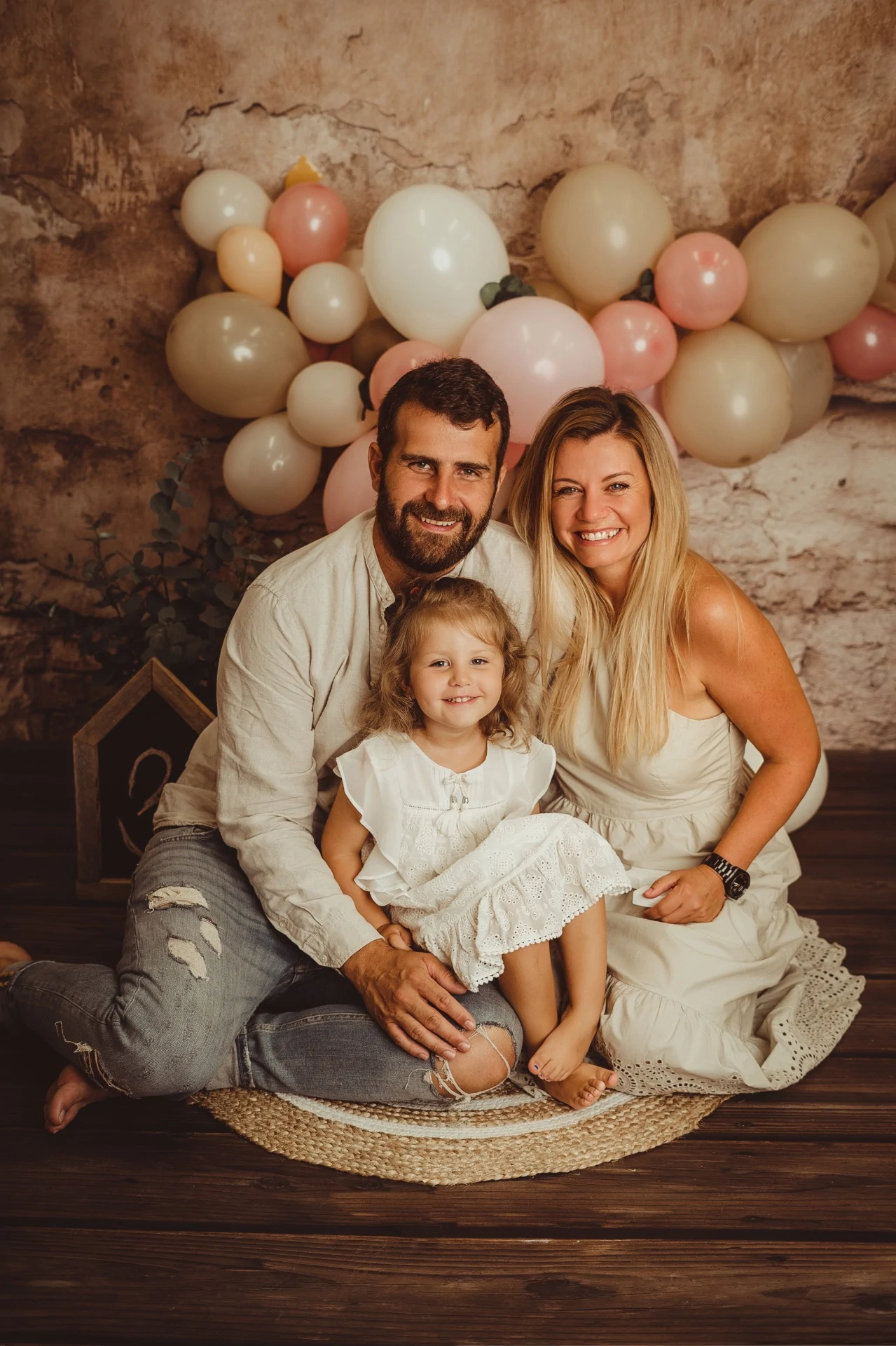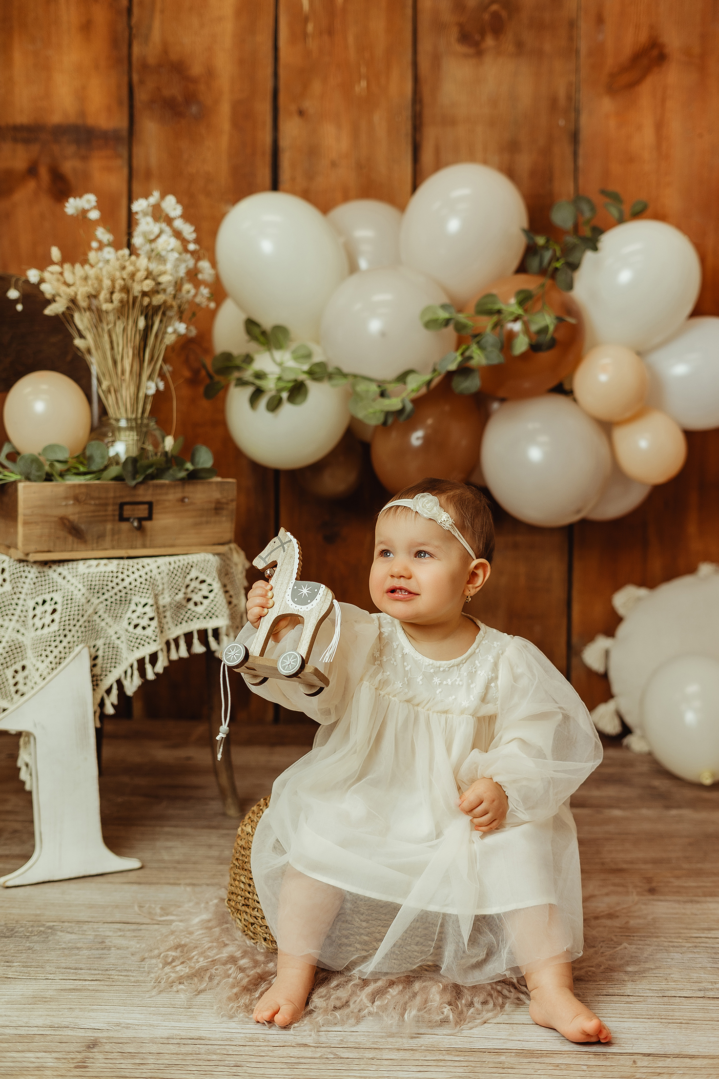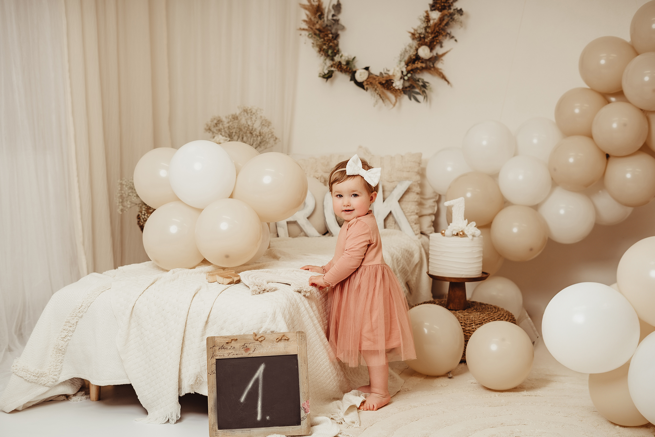 Narozeninové focení probíhá v mém příjemném fotostudiu, kde pro každého malého oslavence připravuji individuální balónkovou výzdobu. Každá scéna je laděná na míru podle vybrané barevné kombinace, aby fotografie působily harmonicky a nadčasově.